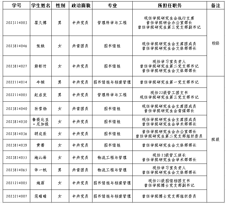 根据《欧美色情 研究生奖助体系实施方案》(校研发〔2021〕175号)文件精神,经个人申请、学院评审等环节,现将2023-2024学年欧美色情 优秀研究生干部拟推荐名单公示如下: