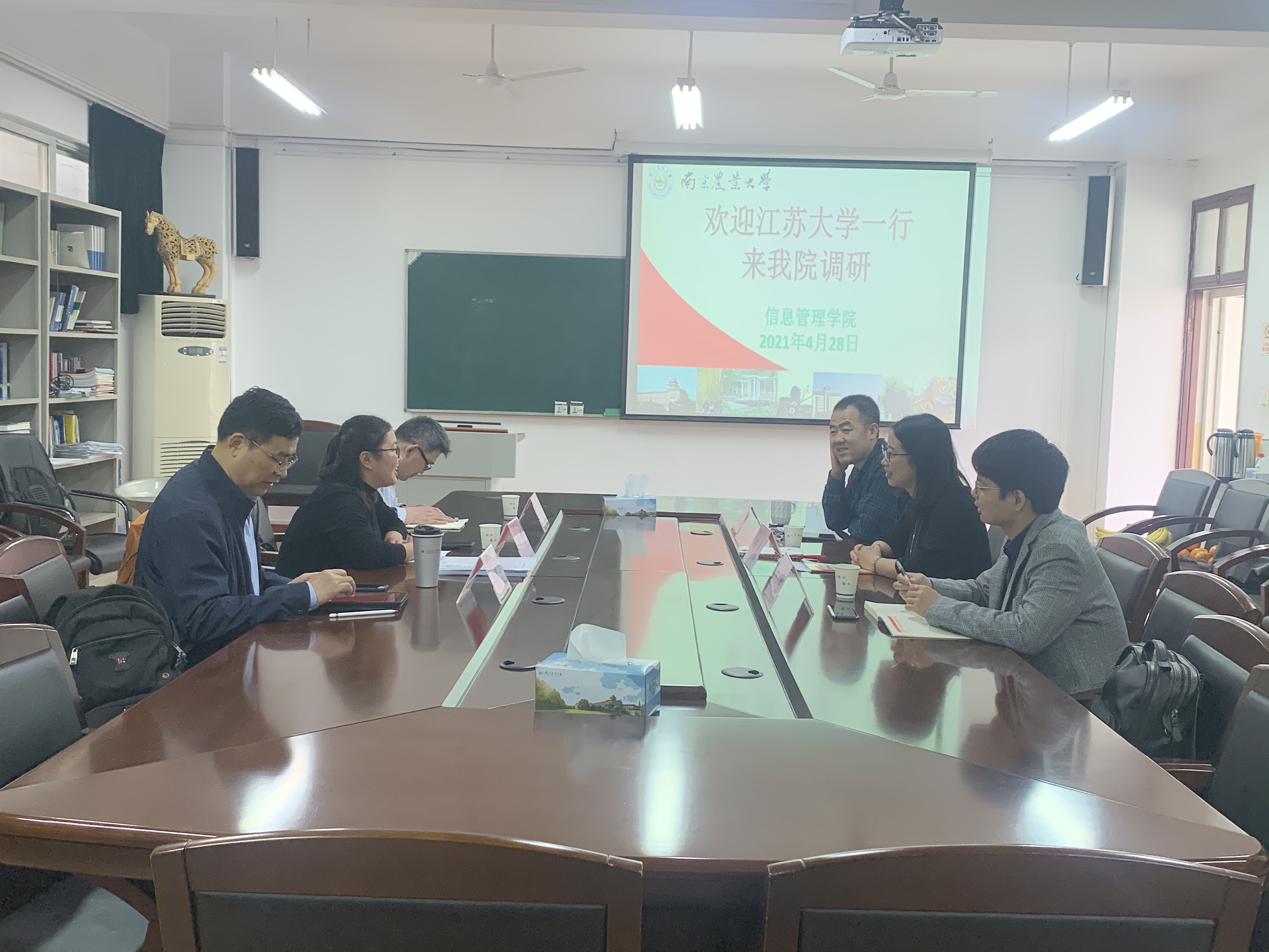 2021年4月28日下午,江苏大学图书馆张晓阳副馆长、刘竟副馆长及科技信息研究所刘桂锋所长来欧美色情 交流。欧美色情 何琳副院长、信息管理科学系付少雄主任及杨波教授参加交流研讨。何琳副院长主持会议。