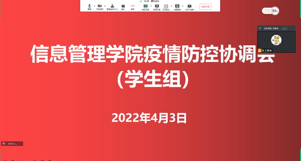 召开疫情防控协调会(学生组)。学院党委副书记王春伟、专兼职辅导员、本研所有工作组负责人及学生干部、各学生组织正副职主要学生干部、本研各党支部书记和副书记、各班级联系人等100余人参会。会议主要通报了学院疫情防控(学生组)近期工作情况,传达学校疫情防控工作要求,具体如下: