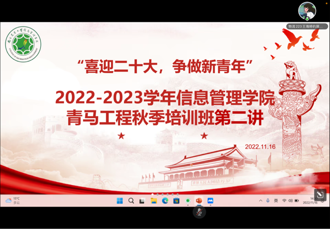 学生组织办公室在11月16日开展的青马工程第二期在线上顺利举行。本次活动邀请了学生会主席陈佳烨和青媒主席唐语舒,就基本技能培训与新媒体运营进行分享。