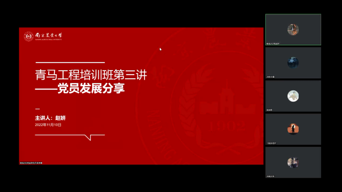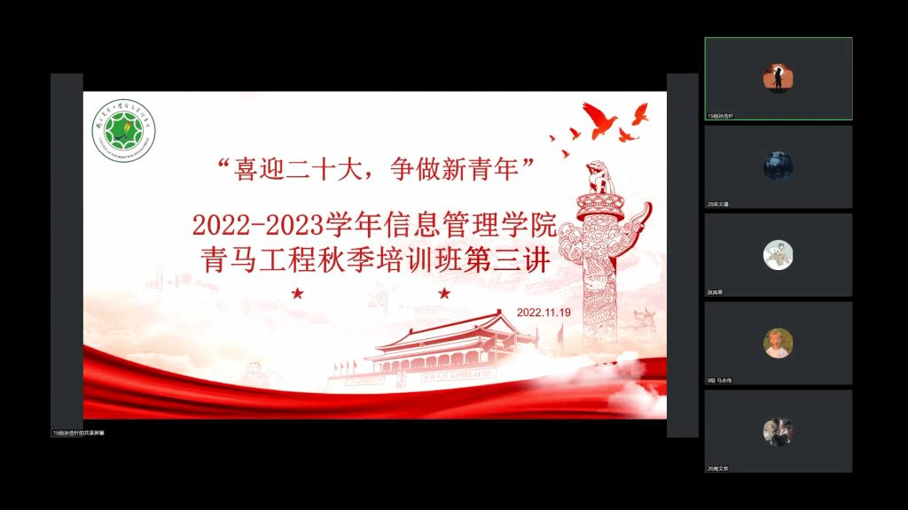 新生学生干部对团员、党员的认识以及公文写作能力,11月19日“青马工程”秋季培训班第三次培训会线上会议如期举办。会议由团委副书记段其萌、党建班副班长赵妍和学生组织办公室主任黄志恒主讲,欧美色情