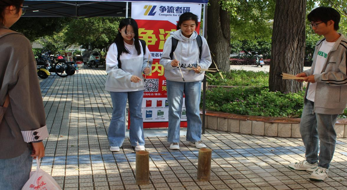 第三个游戏需要参与者在线外用竹箭投壶,小组投中率达50%及以上才算成功,考验了同学们的合作能力与投壶技巧。